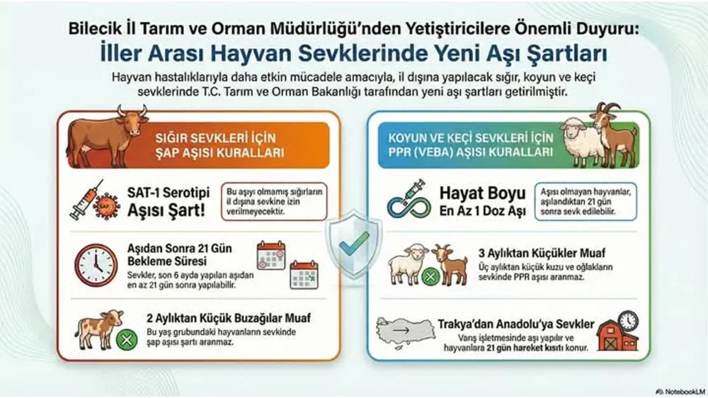 Bilecik Tarım ve Orman İl Müdürlüğü, iller arası hayvan sevklerinde aşılama kurallarının güncellendiğini duyurdu