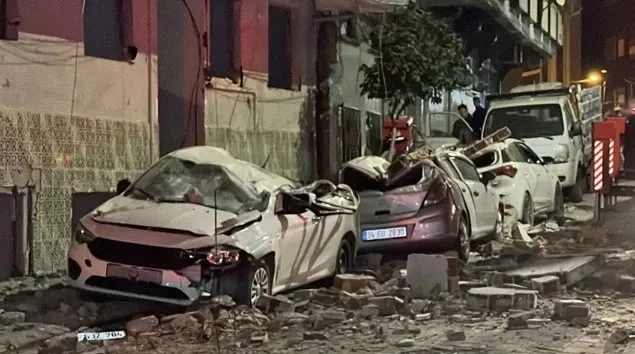 Sokak trafiğe kapatılırken, binanın dış cephesindeki beton parçaları itfaiye ekipleri tarafından merdiven yardımıyla kontrollü şekilde düşürüldü.