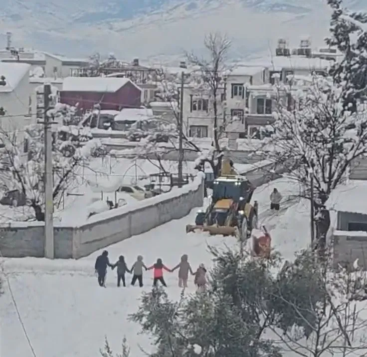 Kahramanmaraş’taki çocuklar, iş makinelerinin bulunduğu alana çıkarak karın temizlenmesini istemediklerini ele ele tutuşarak dile getirdiler. O anlar ise çevrede bulunan vatandaşlar tarafından cep telefonu kameralarıyla kaydedildi.