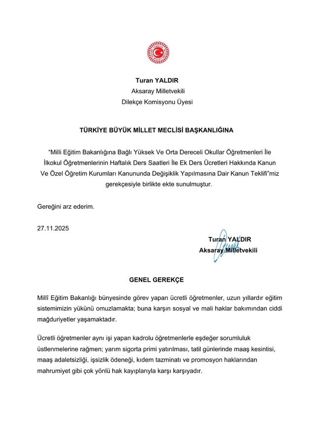 İYİ Parti Aksaray Milletvekili Turan Yaldır, Türkiye’de eğitim sistemini ayakta tutan ancak düşük ücret, yarım sigorta primi ve iş güvencesi eksikliği nedeniyle uzun süredir ciddi hak kayıpları yaşayan ücretli öğretmenler için kapsamlı bir yasa teklifi hazırladı. Yaldır’ın, gerekçeleriyle birlikte Türkiye Büyük Millet Meclisi Başkanlığı’na sunduğu teklif, hem kamu okullarında görev yapan ücretli öğretmenlere kadro yolu açıyor hem de özel öğretim kurumlarındaki öğretmenlerin maaş standardını yükseltiyor.
