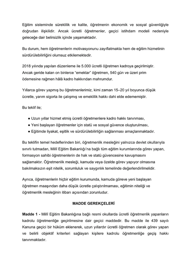 Teklifin kritik maddelerinden biri, en az 540 gün sigorta primi bulunan ve uzun süre görev yapan ücretli öğretmenlerin kadrolu öğretmenliğe geçirilmesi. Böylece yıllardır aynı okulda hizmet veren ancak geçici statü nedeniyle geleceğini planlayamayan binlerce öğretmen için kadro umudu doğuyor.