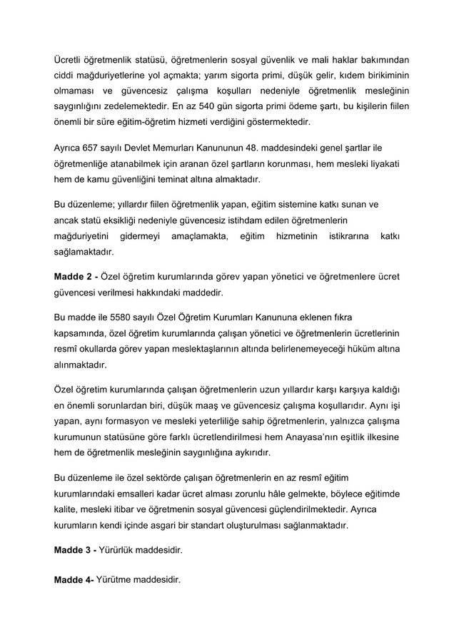 Teklifin genel gerekçesinde, ücretli öğretmenlerin yıllardır eğitim sistemine omuz verdiği ancak sosyal haklar konusunda en çok mağduriyet yaşayan çalışan gruplarının başında geldiği vurgulandı. Yaldır, yarım sigorta primi uygulaması, tatil günlerinde ücret kesintisi, düşük gelir, kıdem oluşmaması ve iş güvencesi eksikliği gibi sorunların artık çözüme kavuşturulması gerektiğini belirtti.