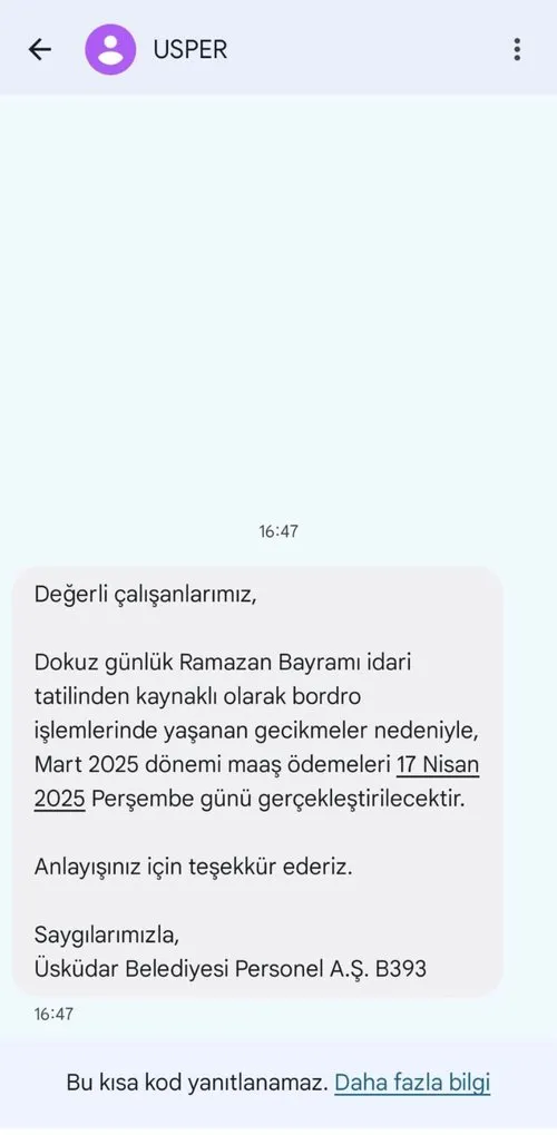 Belediye tarafından personele gönderilen mesajda "Değerli çalışanlarımız, dokuz günlük Ramazan Bayramı idari tatilinden kaynaklı bordro işlemlerinde yaşanan gecikmeler nedeniyle, Mart 2025 dönemi maaş ödemeleri 17 Nisan 2025 Perşembe günü gerçekleştirilecektir. Anlayışınız için teşekkür ederiz" ifadelerine yer verildi.